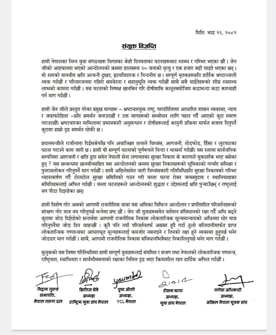 युवा संगठनहरूले भ्रष्टाचारमुक्त राष्ट्र निर्माण, पारदर्शिता र जवाफदेहितामा आधारित शासन प्रणालीको पक्षमा दृढ समर्थन जनाएका छन्। प्रधानमन्त्रीको राजीनामापछि उत्पन्न अस्थिर परिस्थितिमा अवाञ्छित तत्वद्वारा गरिएका हिंसात्मक गतिविधिहरू—जसमा आगजनी, तोडफोड, लूटपाट र सार्वजनिक सम्पत्तिमा क्षति पुगेको छ—प्रति कडा निन्दा गरिएको छ।