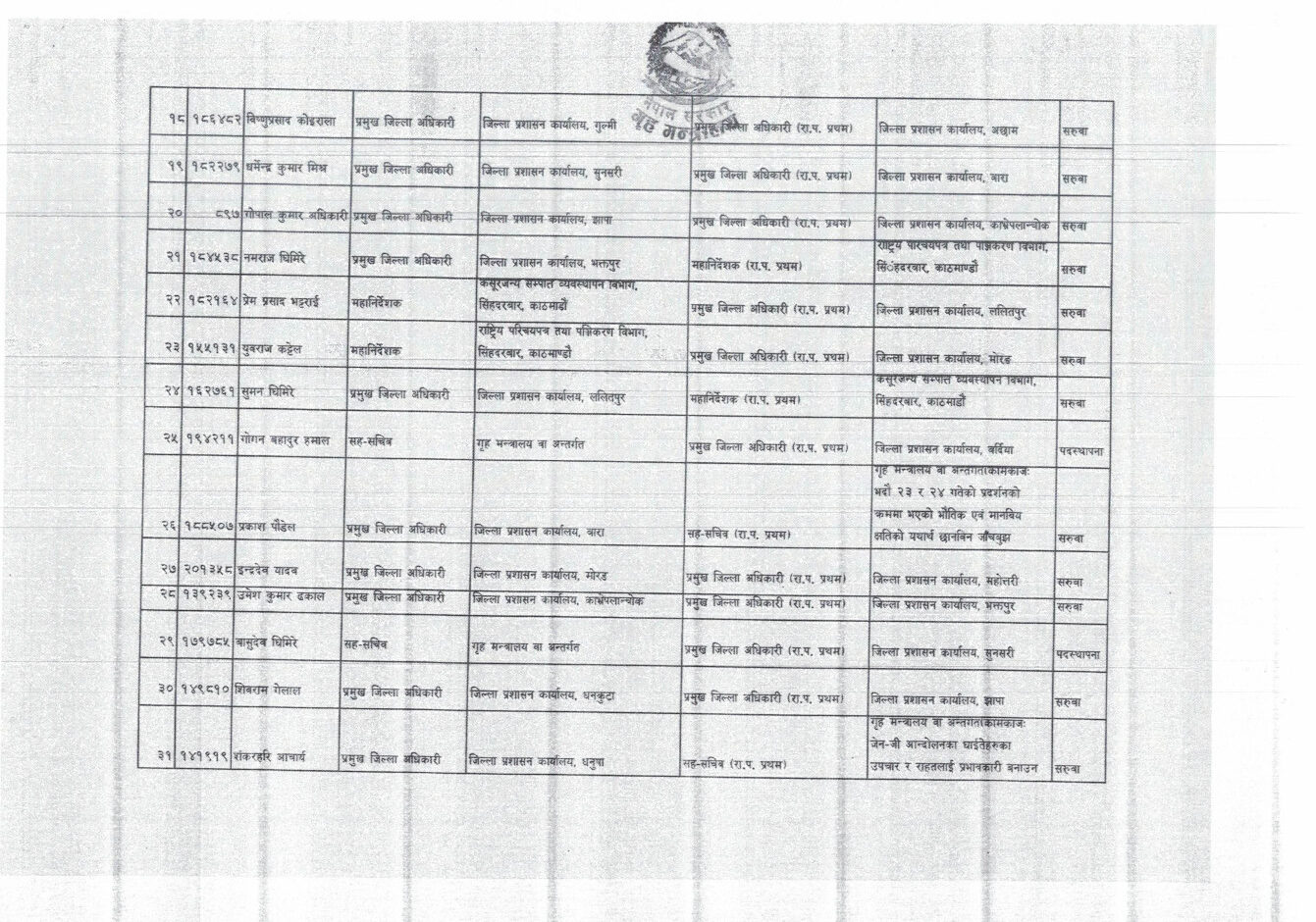काठमाडौं — नेपाल सरकारको गृह मन्त्रालयले प्रशासनिक पुनर्संरचना अन्तर्गत देशभरका ३६ जना प्रमुख जिल्ला अधिकारी (प्रजिअ) तथा सहसचिवहरूको सरुवा गरेको छ। गृहमन्त्रीस्तरीय निर्णयअनुसार मन्त्रालय मातहतका दुई विभागका महानिर्देशकहरू समेत सरुवा भएका छन्।